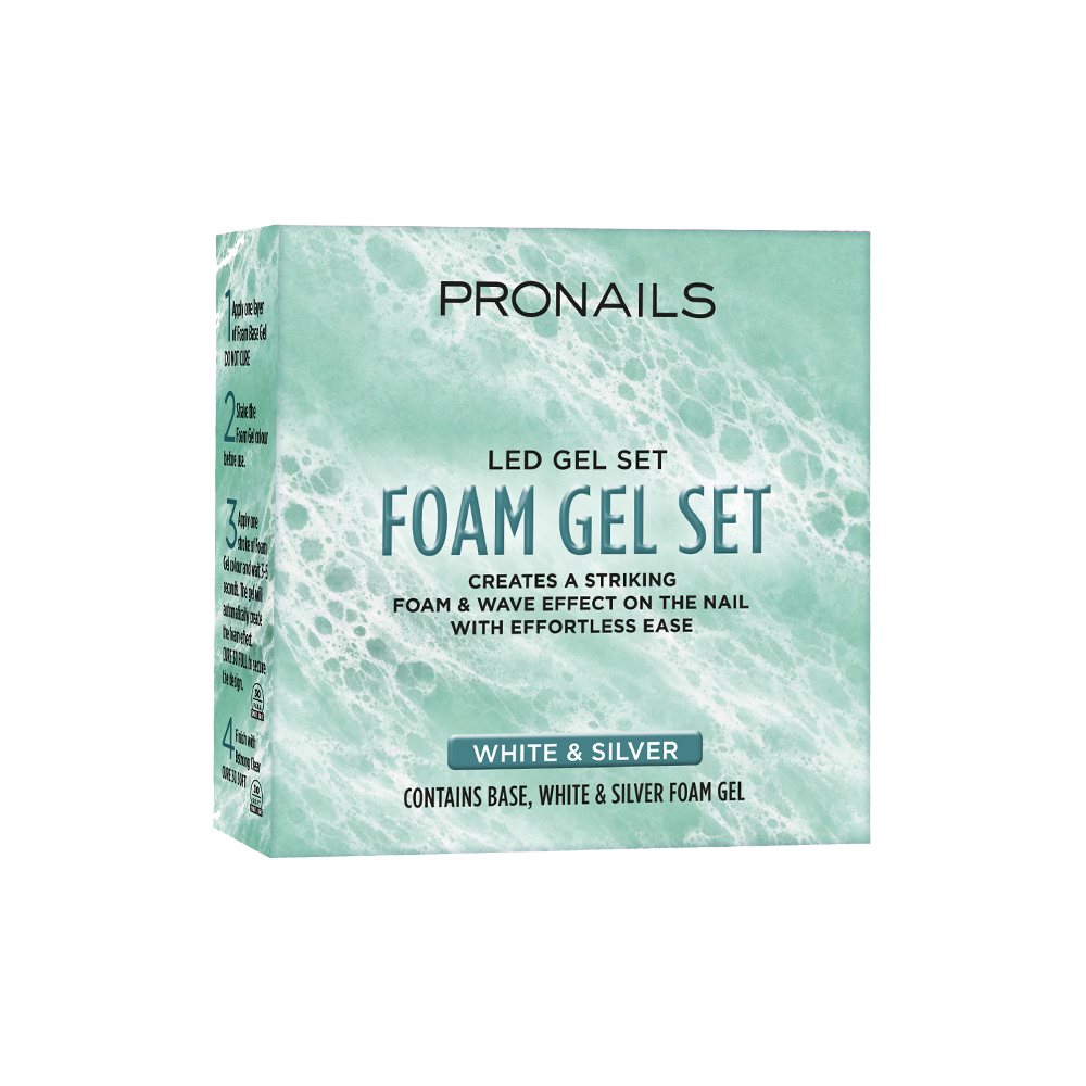 Settet inneholder Foam Gel Base, White og Silver som jobber sammen for å skape alt fra subtile bobler til mer markante design. Påfør farge over ikke herdet base og la effekten utvikle seg umiddelbart.